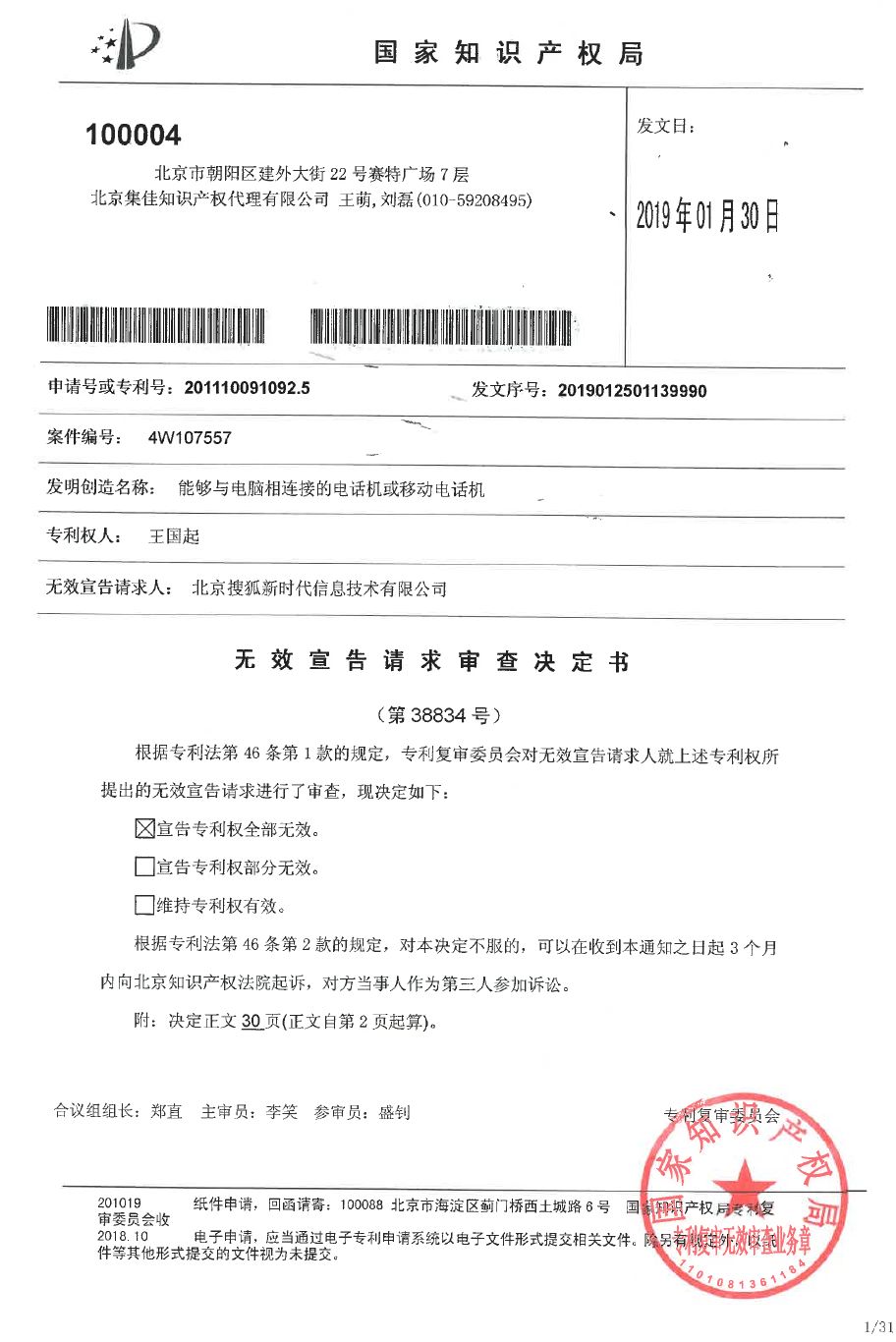 集佳成功无效王国起专利,还移动通信、互联网及金融行业以宁静